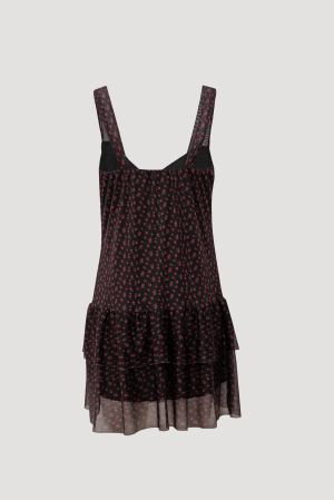A versão com estampa de mini buquê de flores possui modelagem acinturada com alças largas, decote em V e detalhe franzido no busto. A saia com babados traz movimento e feminilidade ao look. Disponível por R$ 99,90.